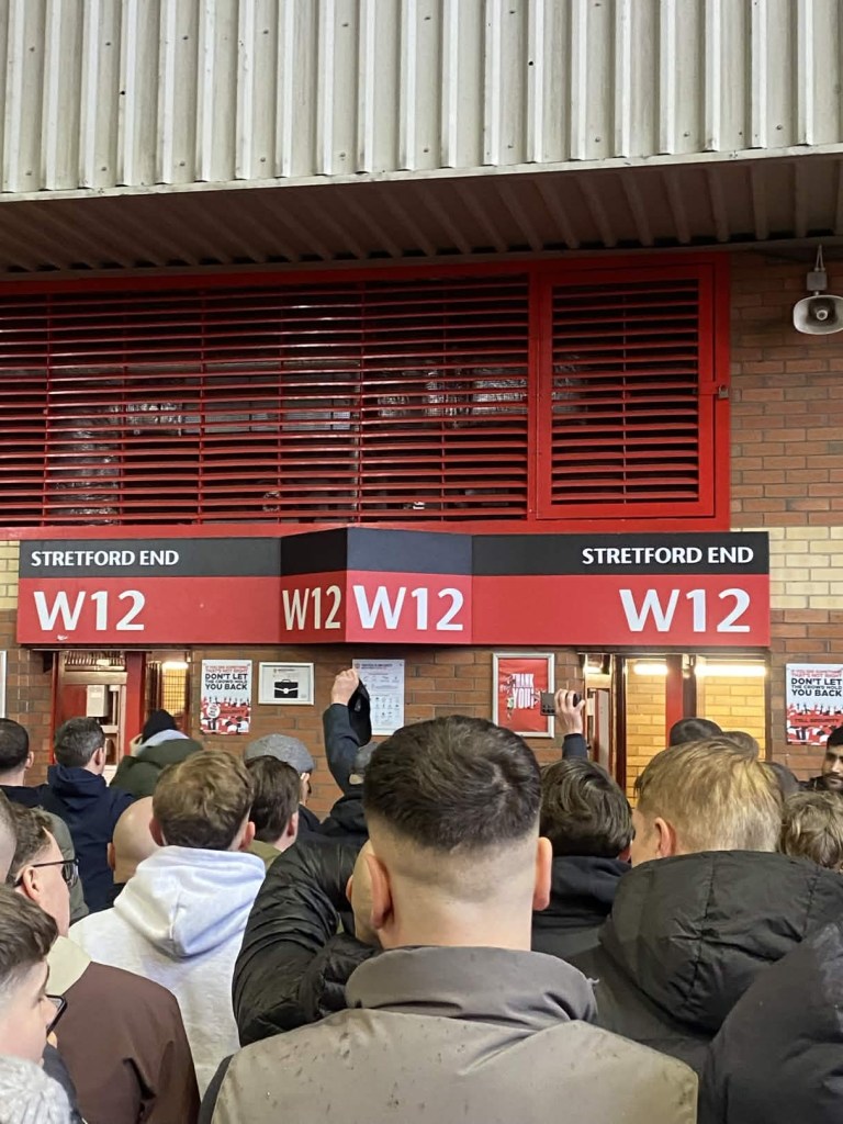 After that I made my way to W12, the Stretford End entrance. While standing in the queue, I was buzzing with excitement. I felt proud and so emotional that I was finally going to stand in the Stretford End. I wanted to capture the moment, so I took a short video while United fans were chanting around me.